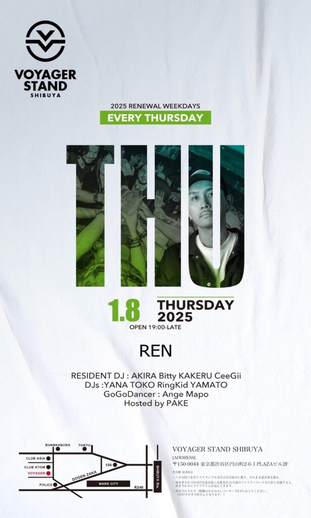 On Thursday, January 8th, DJ REN will be making a regular appearance at Shibuya VOYAGER.